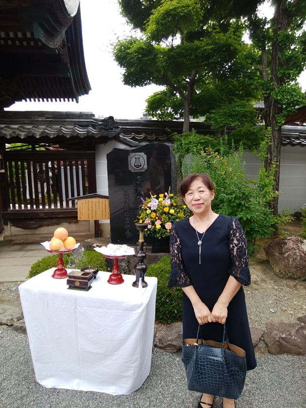 碑の前で