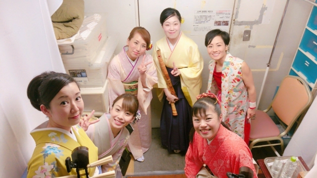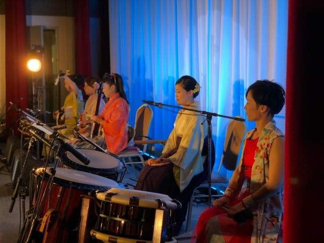 右からはぐいっとリードして下さる土生みさおさんの津軽三味線、大安心の津軽三味線&締め太鼓の田中志穂さん、優しくて打楽器でものせて下さる、同じく津軽三味線の小山貢理乃さん、左からは力強い高木てんさんの和太鼓が!